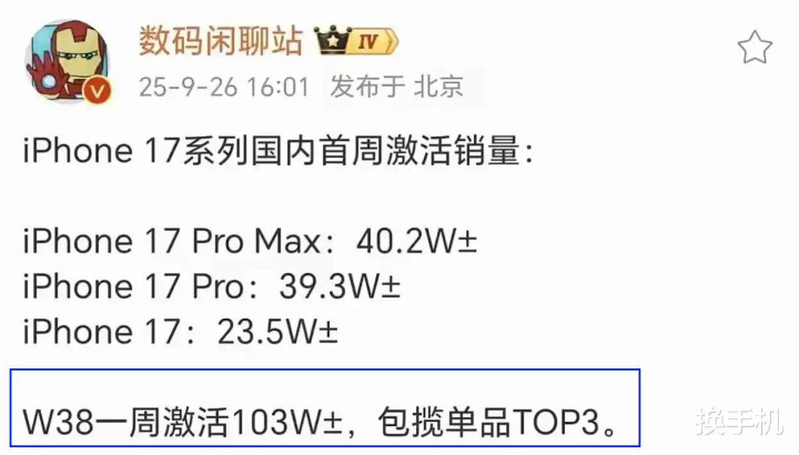 iPhone17系列在国内上市首周的激活量为103万+台,其中ProMax和Pro都在40万台左右,标准版为23.5万台左右。