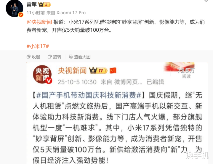 近期,央视也在为小米站台,根据央视新闻的报道:凭借独特的妙享背屏创新和影像能力等卖点,小米 17 系列成为消费者新宠,销量破100万台,只用了5天。雷军也进行了转发。