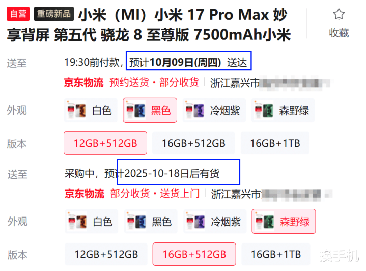 小米17系列缺货的是Pro Max机型,目前京东自营平台显示,现在下单的话,只有12+512G黑色可以做到3天后(10月9日)送达。其他版本颜色,预计有货时间,都是12天之后(10月18日)。