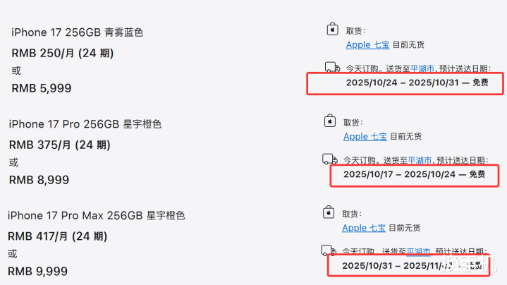 iPhone17 Pro预计送达时间10月17日至24日,看样子备货已经慢慢上来了。